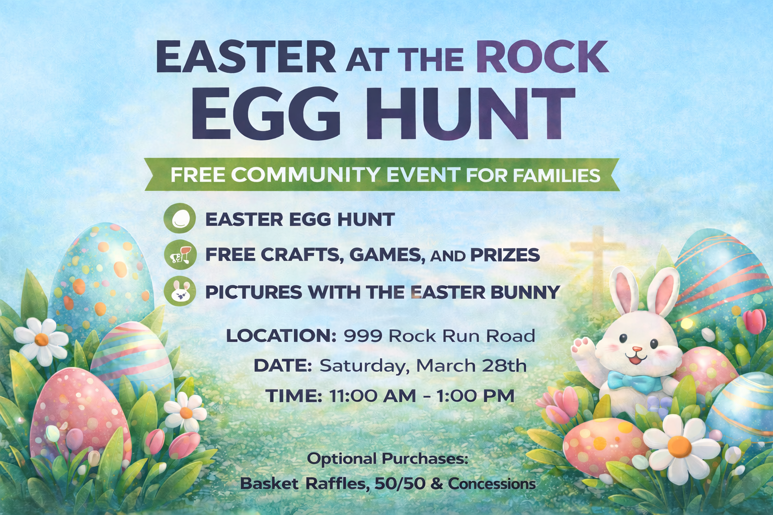 Join us for a free family-friendly community event featuring an Easter egg hunt, crafts, games, prizes, and pictures with the Easter Bunny and friends.